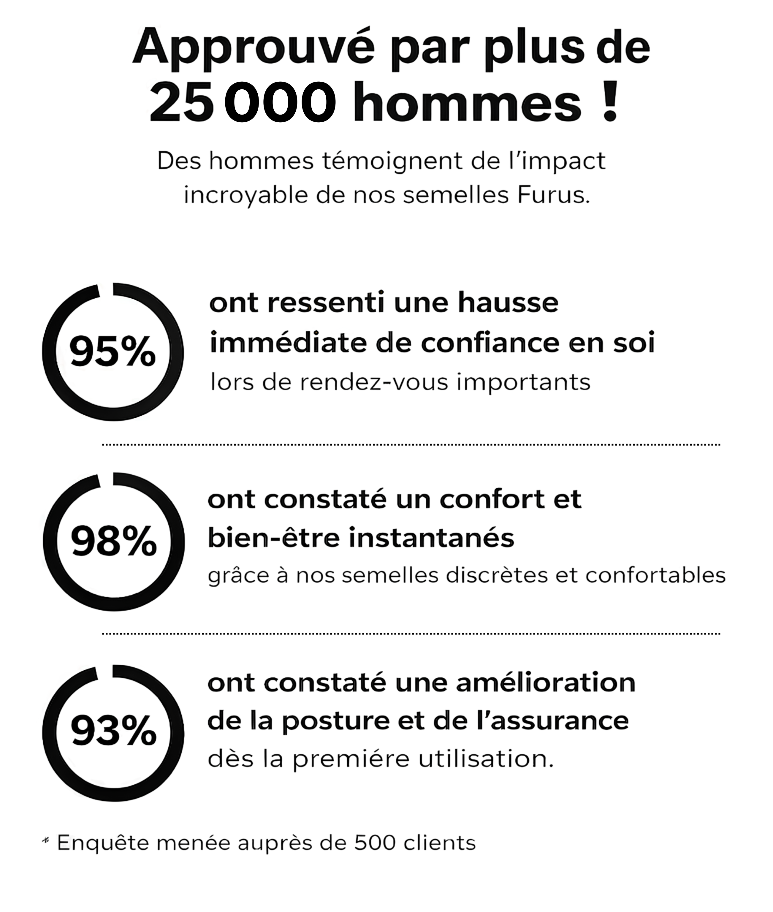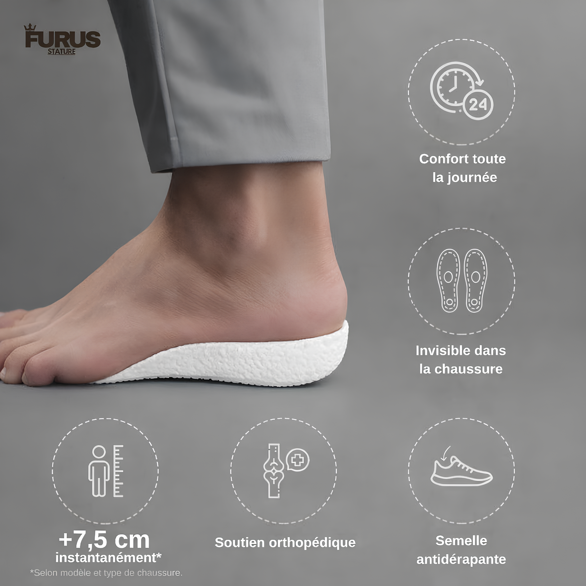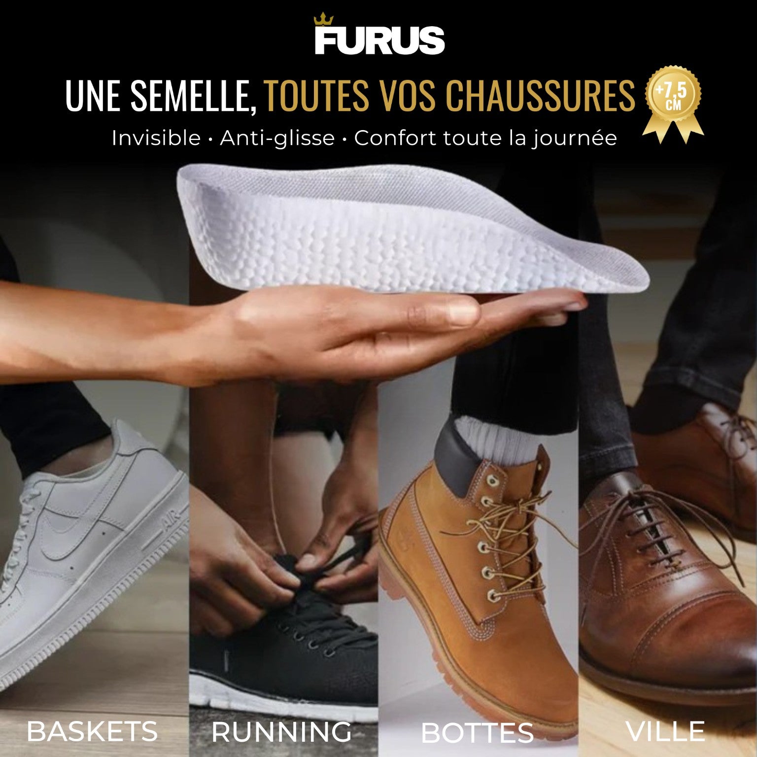 Les semelles Furus Stature™ s’adaptent à toutes vos paires. Invisibles et discrètes, personne ne saura votre secret.