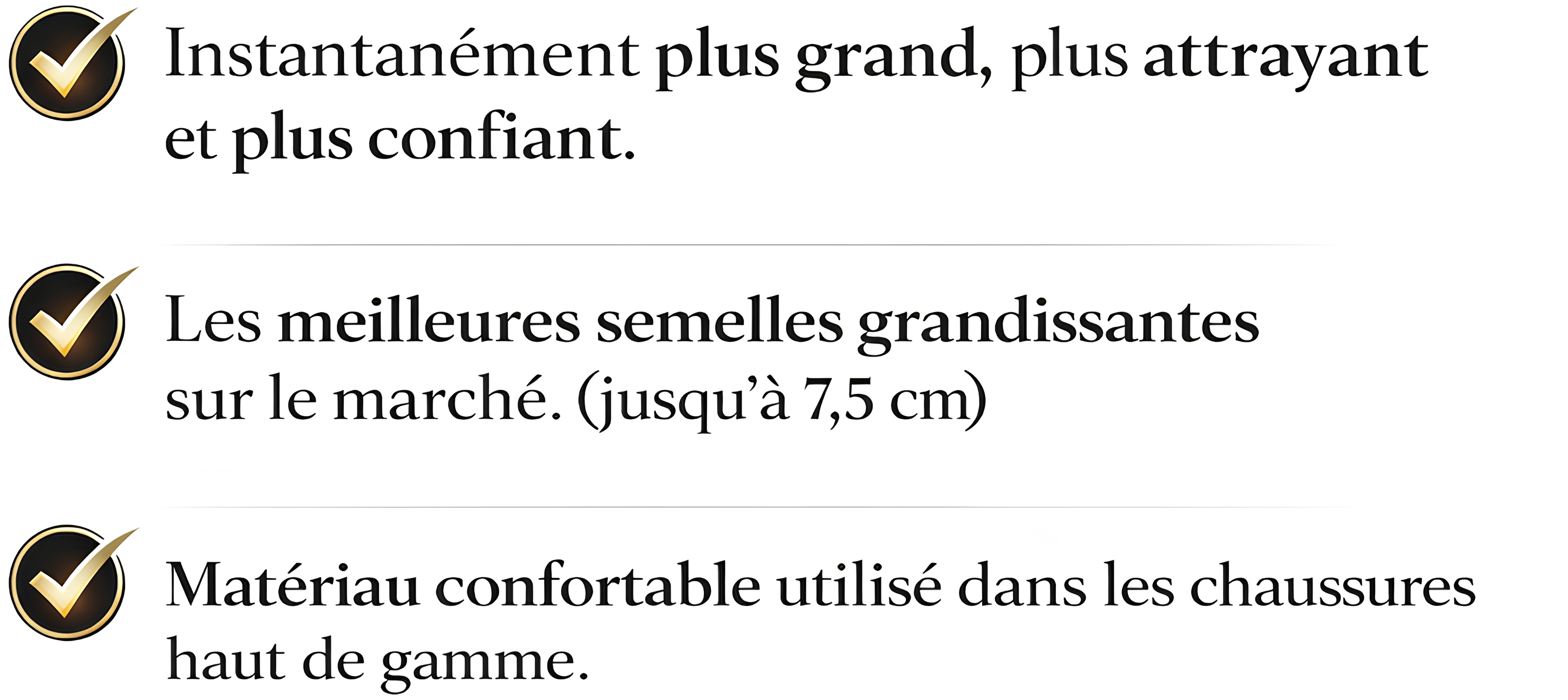 ✅ +7,5 cm instantanément : confiance, charisme et prestance dès la première utilisation